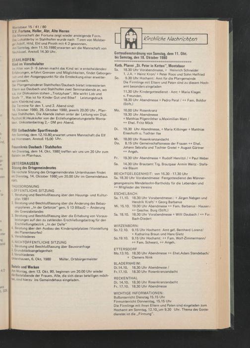 14. Oktober 1980, 28. Oktober 1980, jeweils 20.00 Uhr, Pfarrhaus Stahlhofen. Die Abende stehen unter der Leitung von Dipl. Psychol.W.Heukäufer von der Erziehungsberatungsstelle Montabaur. Unkostenbeitrag 2,-- DM pro Abend.