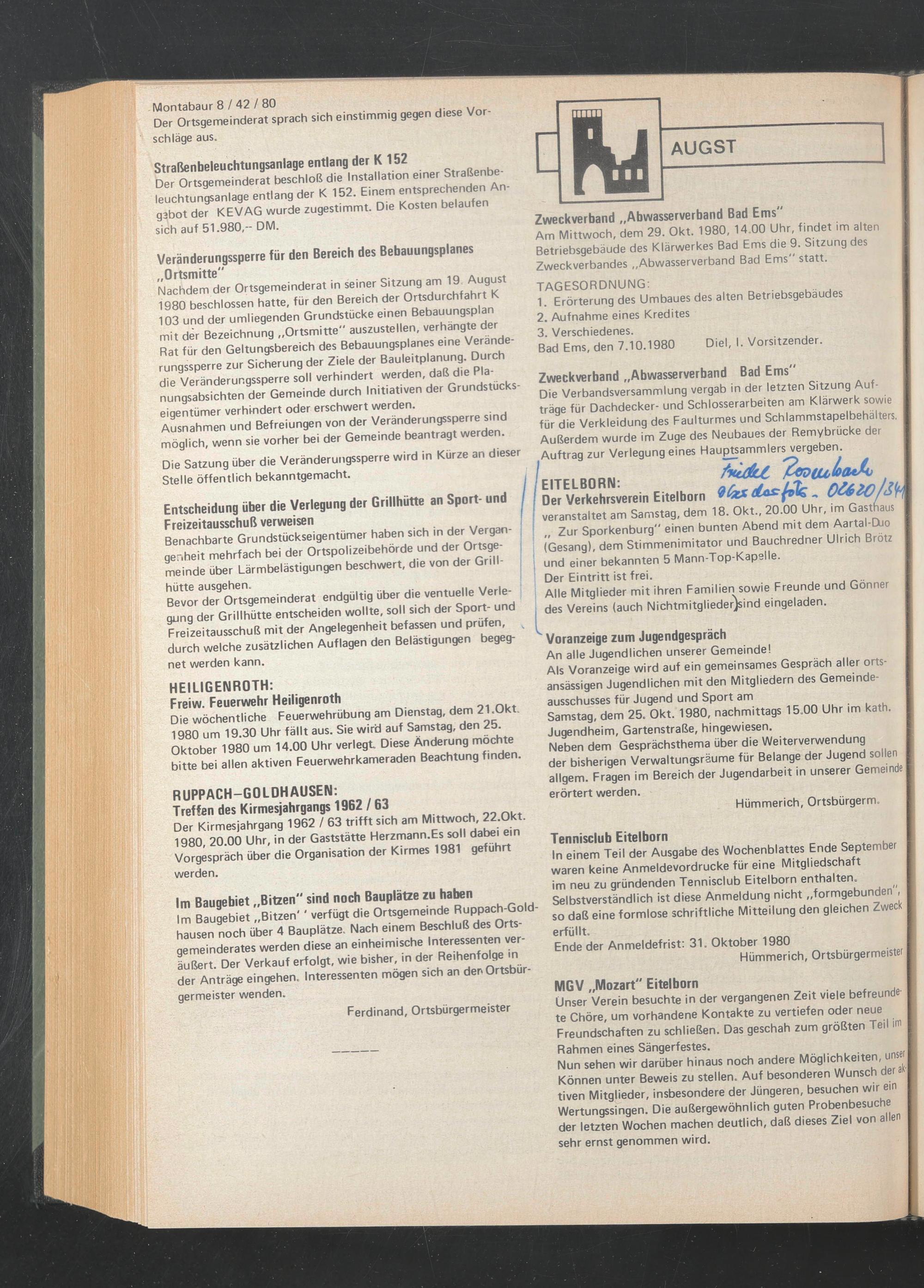 Als Voranzeige wird auf ein gemeinsames Gespräch aller ortsansässigen Jugendlichen mit den Mitgliedern des Gemeindeausschusses für Jugend und Sport am Samstag, dem 25. Okt. 1980, nachmittags 15.00 Uhr im kath. Jugendheim, Gartenstraße, hingewiesen.
