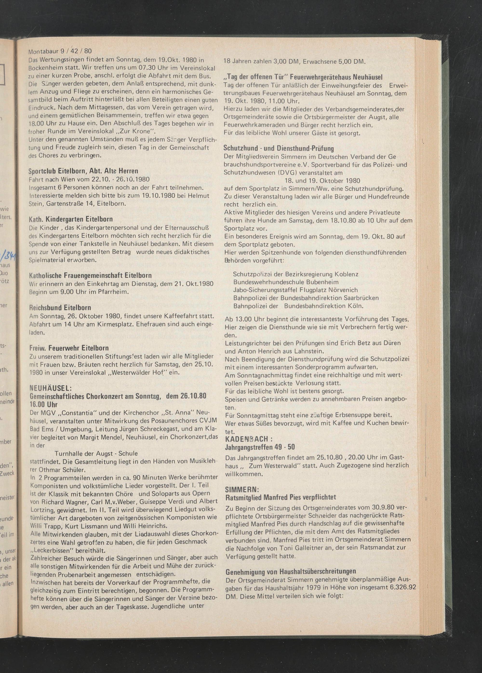 Zu Beginn der Sitzung des Ortsgemeinderates vom 30.9.80 verpflichtete Ortsbürgermeister Schneider das nachgerückte Ratsmitglied Manfred Pies durch Handschlag auf die gewissenhafte Erfüllung der Pflichten, die mit dem Amt des Ratsmitgliedes verbunden sind. Manfred Pies tritt im Ortsgemeinderat Simmern die Nachfolge von Toni Galleitner an, der sein Ratsmandat zur Verfügung gestellt hatte.