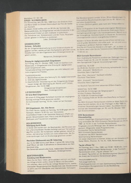 Am Freitag, dem 31, Oktober 1980, findet im Gasthaus zum Westerwald, in Görgeshausen eine Sitzung der Jagdgenossenschaft Görgeshausen statt.