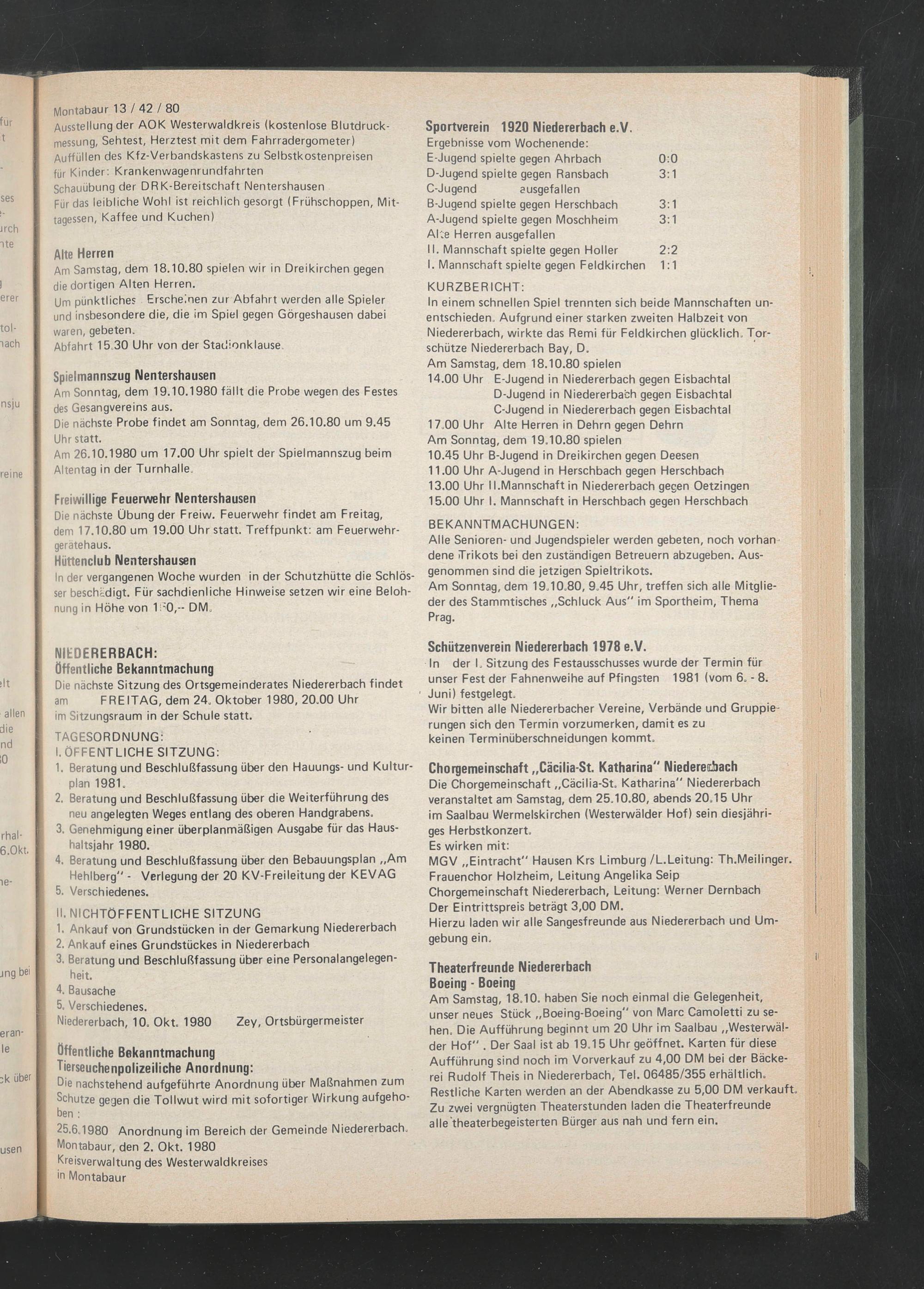 Die nächste Sitzung des Ortsgemeinderates Niedererbach findet am FREITAG, dem 24. Oktober 1980, 20.00 Uhr im Sitzungsraum in der Schule statt.