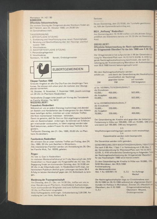 Der Nachtragshaushaltsplan liegt zur Einsichtnahme vom I 20.10.1980 bis 30.10.1980 während der allgemeinen Dienst- I stunden im Rathaus in Montabaur, Zimmer 23, öffentlich aus. I Oberelbert, den 4.10.1980 Ortsgemeindeverwaltung I