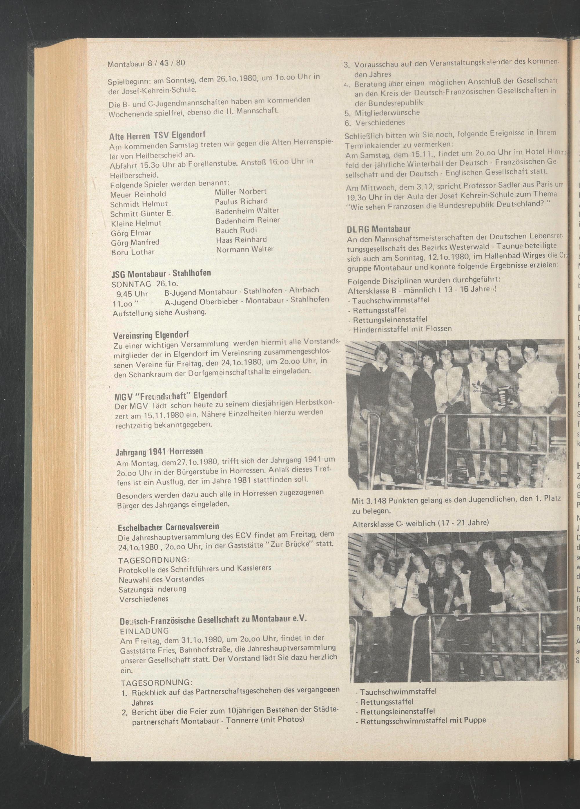 An den Mannschaftsmeisterschaften der Deutschen Lebensrettungsgesellschaft des Bezirks Westerwald - Tau nun beteiligte sich auch am Sonntag, 12.1o. 1980, im Hallenbad Wirges die Ort gruppe Montabaur und konnte folgende Ergebnisse erzielen: