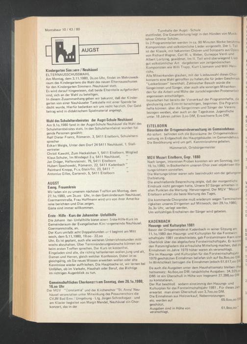 Am 9.1o.1980 fand in der Augst-Schule Neuhäusel die Wahl des Schulelternbeirates statt. In den Schulelternbeirat wurden folgende Personen gewählt: