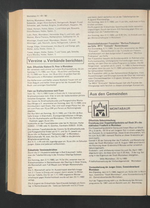 Die nächsten Tauschabende des Vereins für Briefmarkenkunde und Postgeschichte finden am 4.11. und 2o.11. jeweils um 2o.oo Uhr im Restaurant "Schusterjunge" in Montabaur, Bahnhofsstraße 16, statt Am 2o.11.1980 ist die jährliche M itgl iederversamm lu ng.