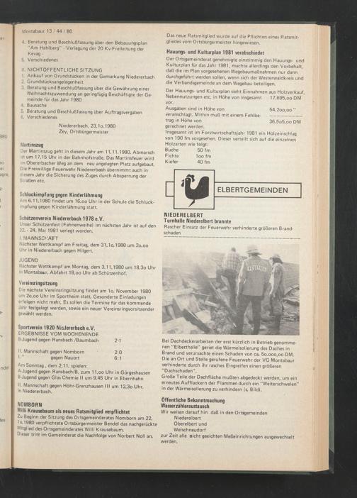 Der Ortsgemeinderat genehmigte einstimmig den Hauungs- und Kulturplan für das Jahr 1981, machte allerdings den Vorbehalt, daß die im Plan vorgesehenen Wegebaumaßnahmen nur dann durchgeführt werden sollen, wenn sich der Westerwaldkreis und die Verbandsgemeinde an dem Wegebau beteiligen.