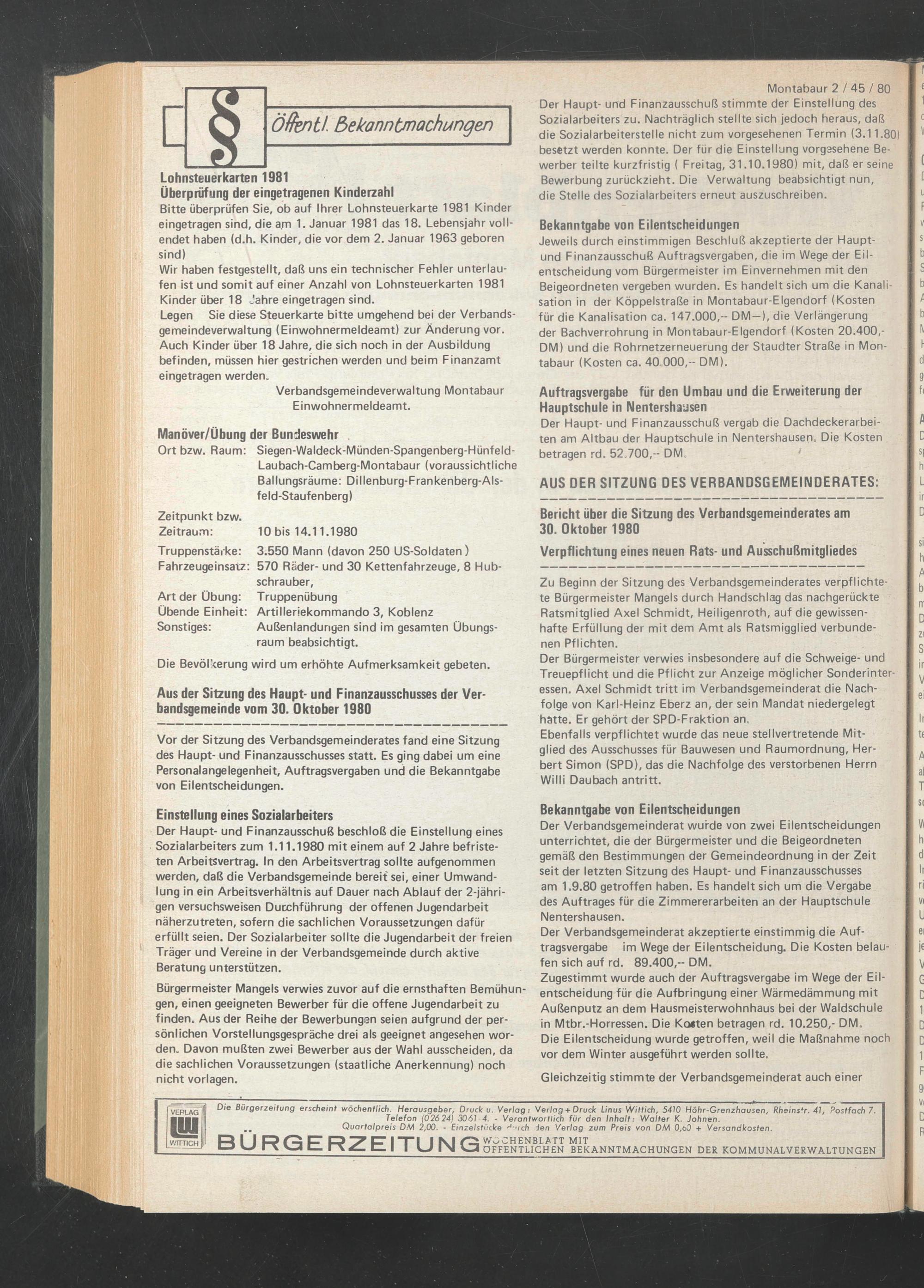 Bericht über die Sitzung des Verbandsgemeinderates am 30. Oktober 1980