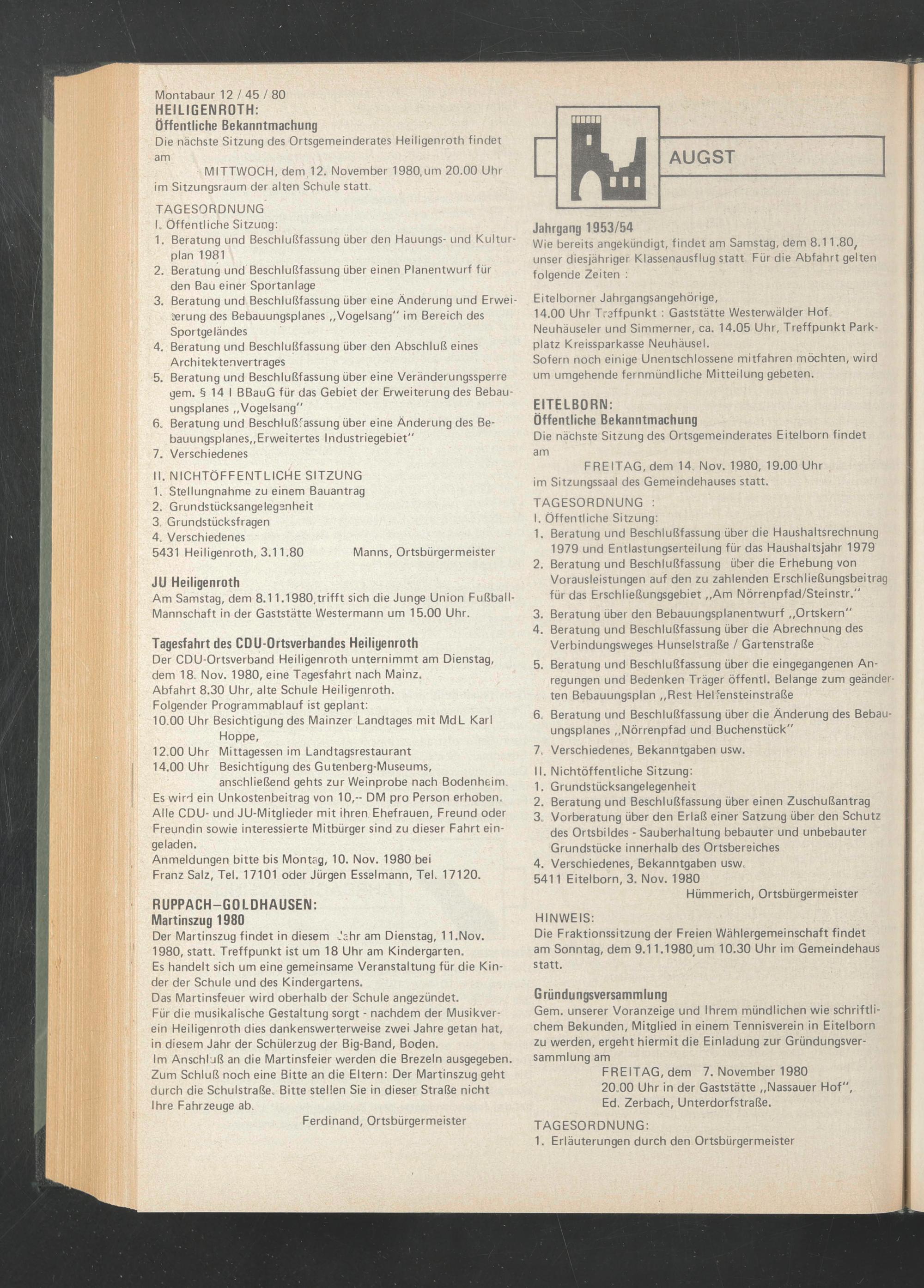 Der CDU-Ortsverband Heiligenroth unternimmt am Dienstag, dem 18. Nov. 1980, eine Tagesfahrt nach Mainz.