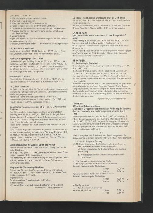 Die nächste Sitzung des Vereinsrings Eitelborn findet am MITTWOCH, dem 12. Nov. 1980, abends 20 Uhr in der Gaststätte „Nassauer Hof" statt.