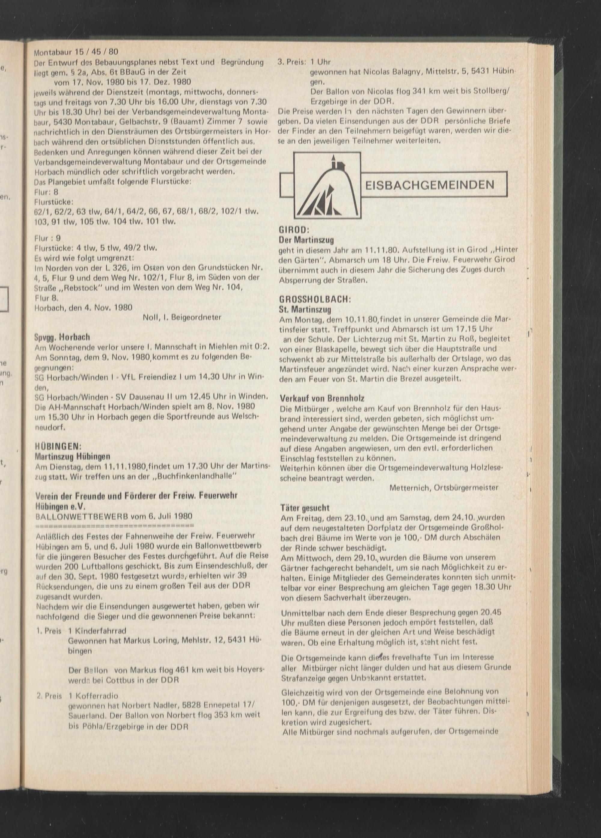 Der Entwurf des Bebauungsplanes nebst Text und Begründung liegt gern. § 2a, Abs. 6t BBauG in der Zeit vom 17. Nov. 1980 bis 17. Dez, 1980 jeweils während der Dienstzeit (montags, mittwochs, donnerstags und freitags von 7.30 Uhr bis 16.00 Uhr, dienstags von 7.30 Uhr bis 18.30 Uhr) bei der Verbandsgemeindeverwaltung Montabaur, 5430 Montabaur, Gelbachstr. 9 (Bauamt) Zimmer 7 sowie nachrichtlich in den Diensträumen des Ortsbürgermeisters in Horbach während den ortsüblichen Disnststunden öffentlich aus, Bedenken und Anregungen können während dieser Zeit bei der Verbandsgemeindeverwaltung Montabaur und der Ortsgemeinde Horbach mündlich oder schriftlich vorgebracht werden,