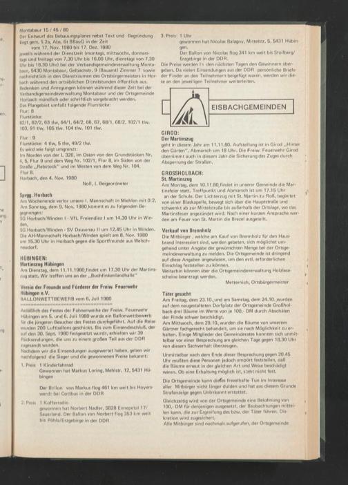 Anläßlich des Festes der Fahnenweihe der Freiw. Feuerwehr Hübingen am 5. und 6. Juli 1980 wurde ein Ballonwettbewerb für die jüngeren Besucher des Festes durchgeführt. Auf die Reise wurden 200 Luftballons geschickt. Bis zum Einsendeschluß, der auf den 30. Sept. 1980 festgesetzt wurde/ erhielten wir 39 Rücksendungen, die uns zu einem großen Teil aus der DDR zugesandt wurden.