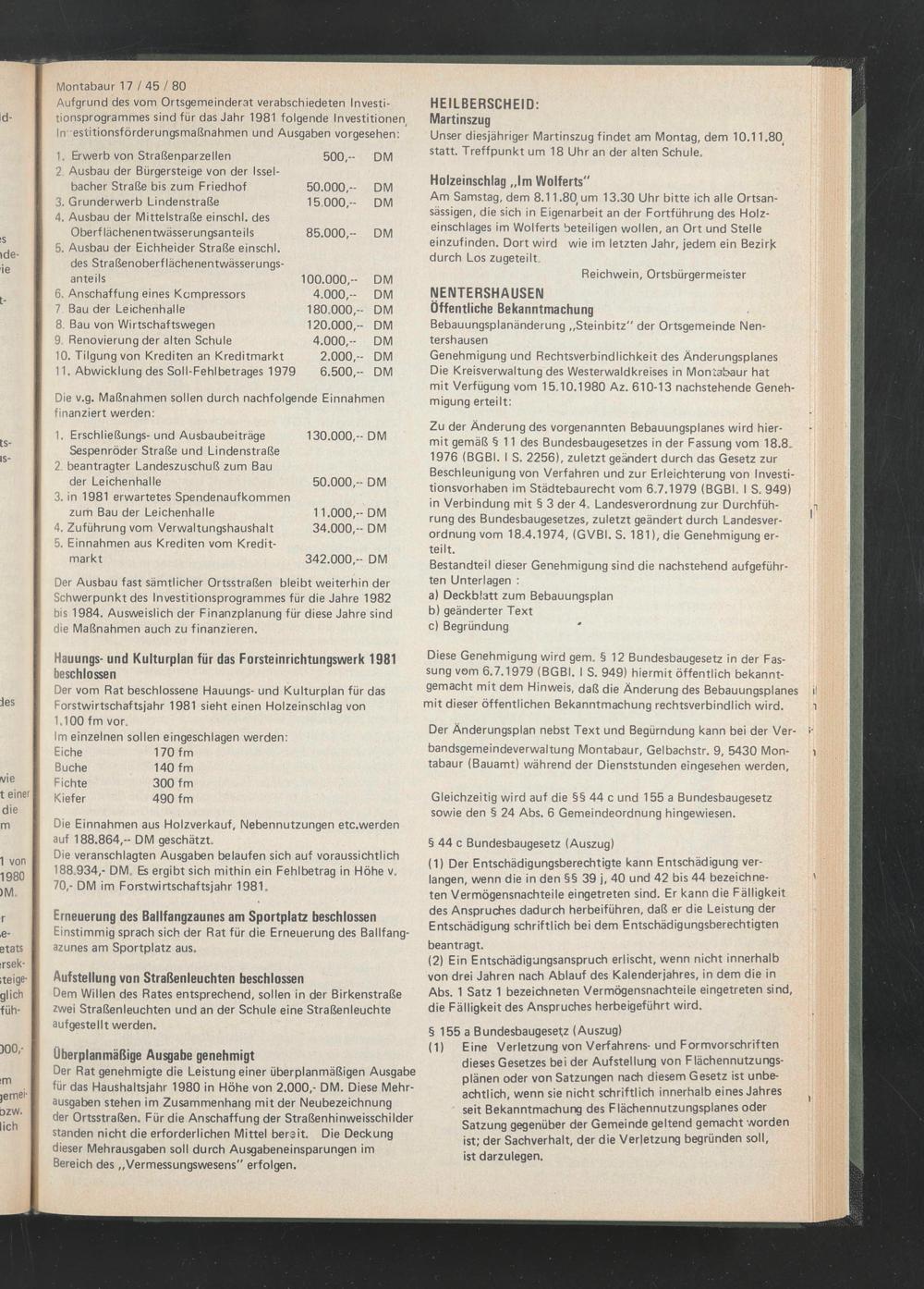 Aufgrund des vom Ortsgemeinderat verabschiedeten Investitionsprogrammes sind für das Jahr 1981 folgende Investitionen In estitionsförderungsmaßnahmen und Ausgaben vorgesehen: