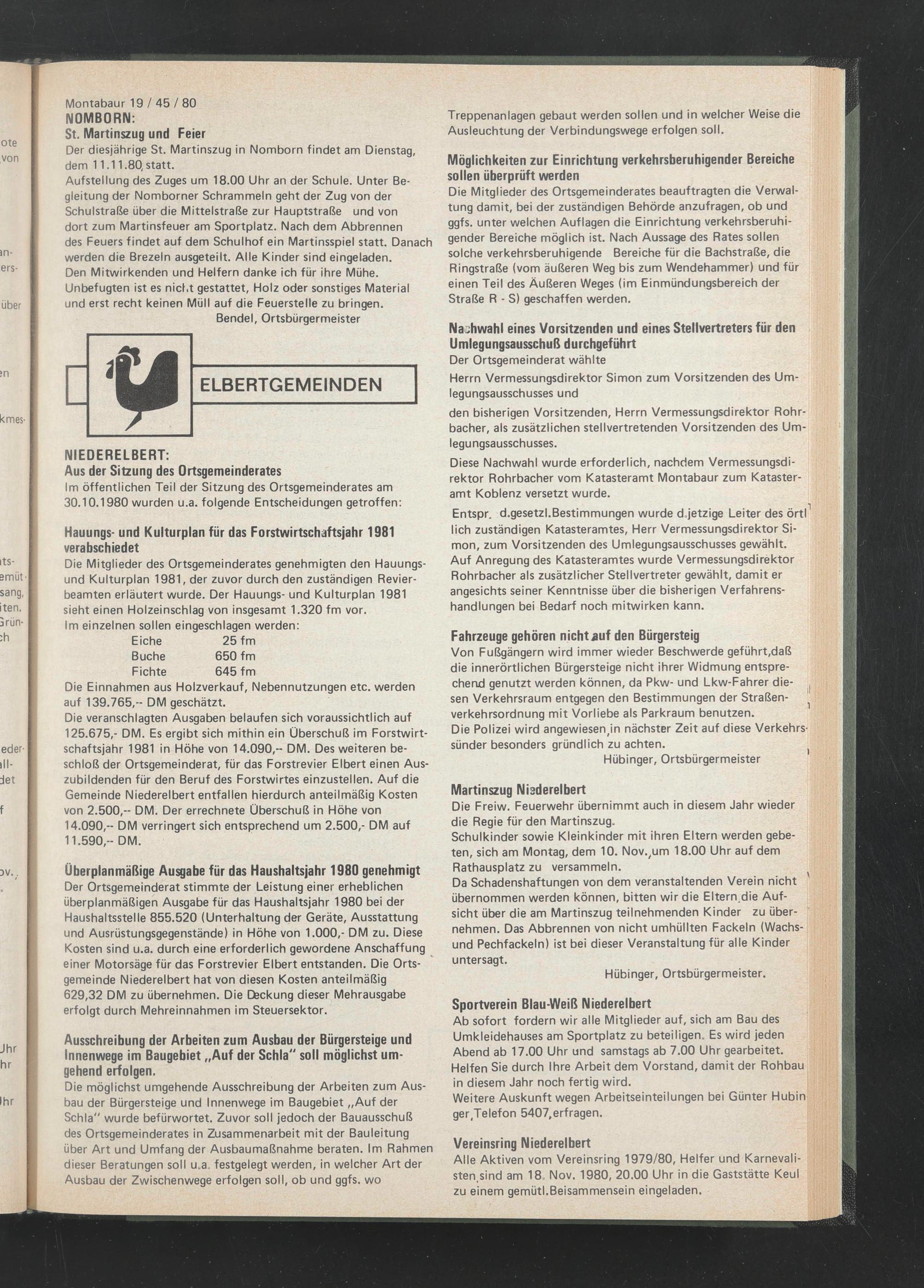 Im öffentlichen Teil der Sitzung des Ortsgemeinderates am 30.10.1980 wurden u.a. folgende Entscheidungen getroffen: