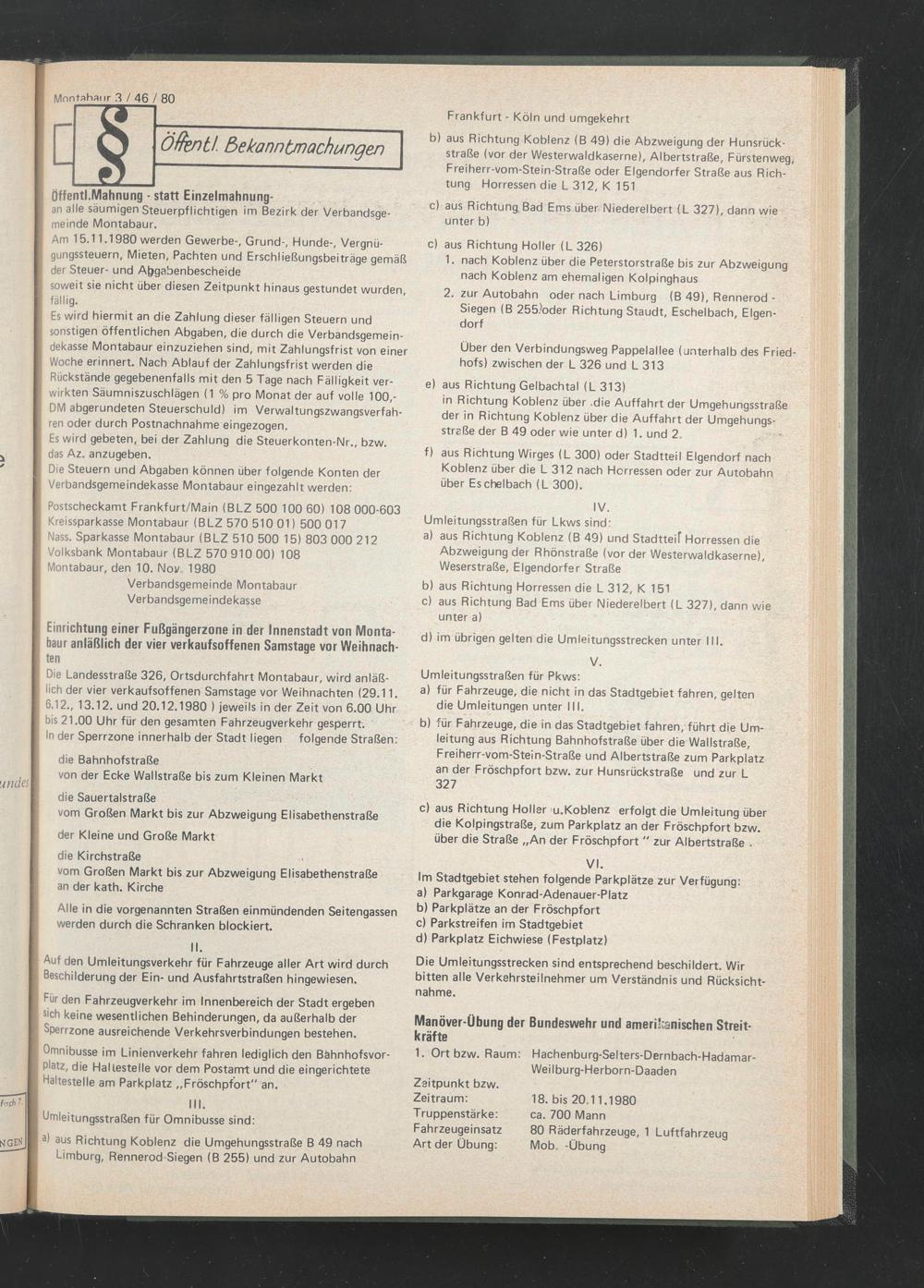 Die Landesstraße 326, Ortsdurchfahrt Montabaur, wird anläßlich der vier verkaufsoffenen Samstage vor Weihnachten (29.11. 6.12., 13.12. und 20.12.1980 ) jeweils in der Zeit von 6.00 Uhr bis 21.00 Uhr für den gesamten Fahrzeugverkehr gesperrt.