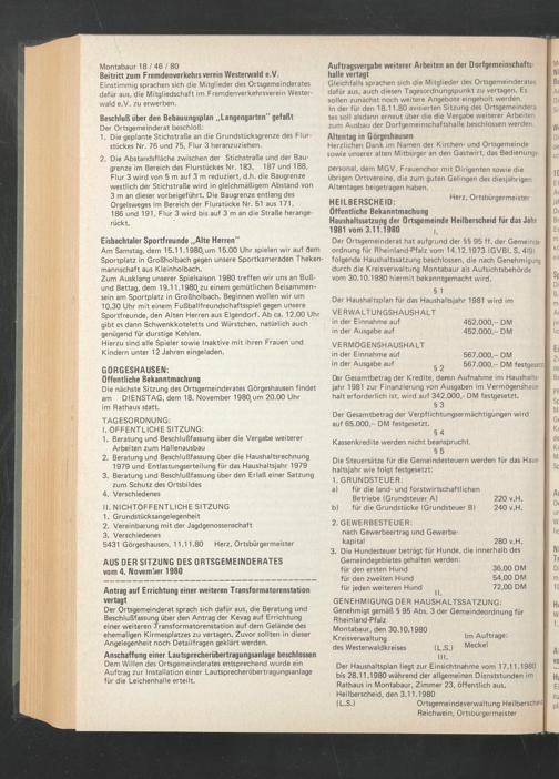 Der Haushaltsplan liegt zur Einsichtnahme vom 17.11.1980 bis 28.11.1980 während der allgemeinen Dienststunden im Rathaus in Montabaur, Zimmer 23, öffentlich aus. Heilberscheid, den 3.11.1980