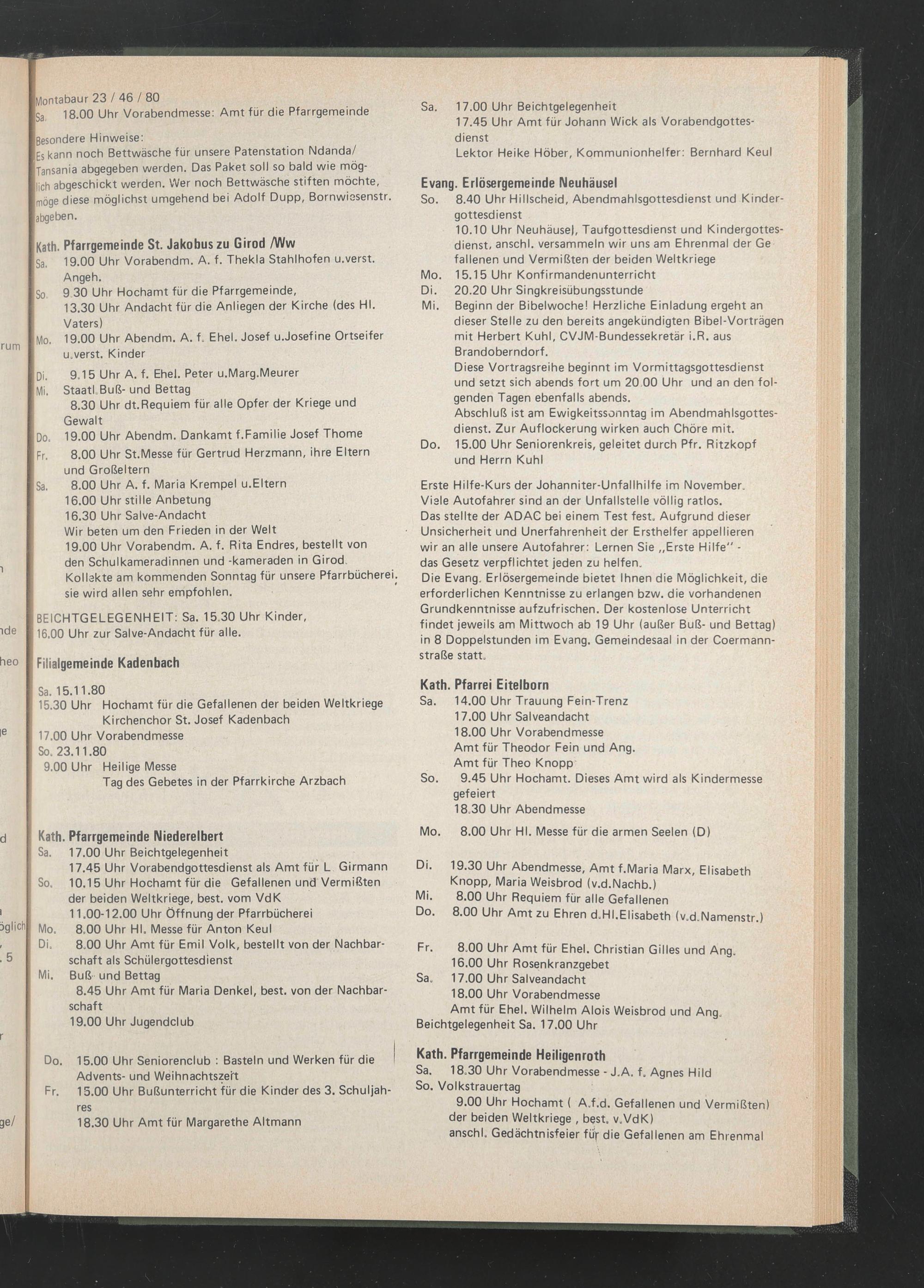 15.30 Uhr Hochamt für die Gefallenen der beiden Weltkriege Kirchenchor St. Josef Kadenbach 17.00 Uhr Vorabendmesse So, 23.11.80 9.00 Uhr Heilige Messe