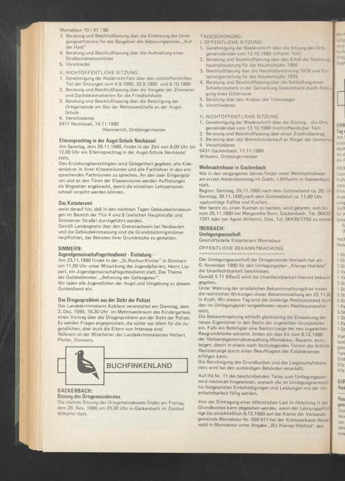 Die nächste Sitzung des Ortsgemeinderates findet am Freitag, dem 28. Nov. 1980, um 20.00 Uhr in Gackenbach im Gasthof Wilhelmi statt.