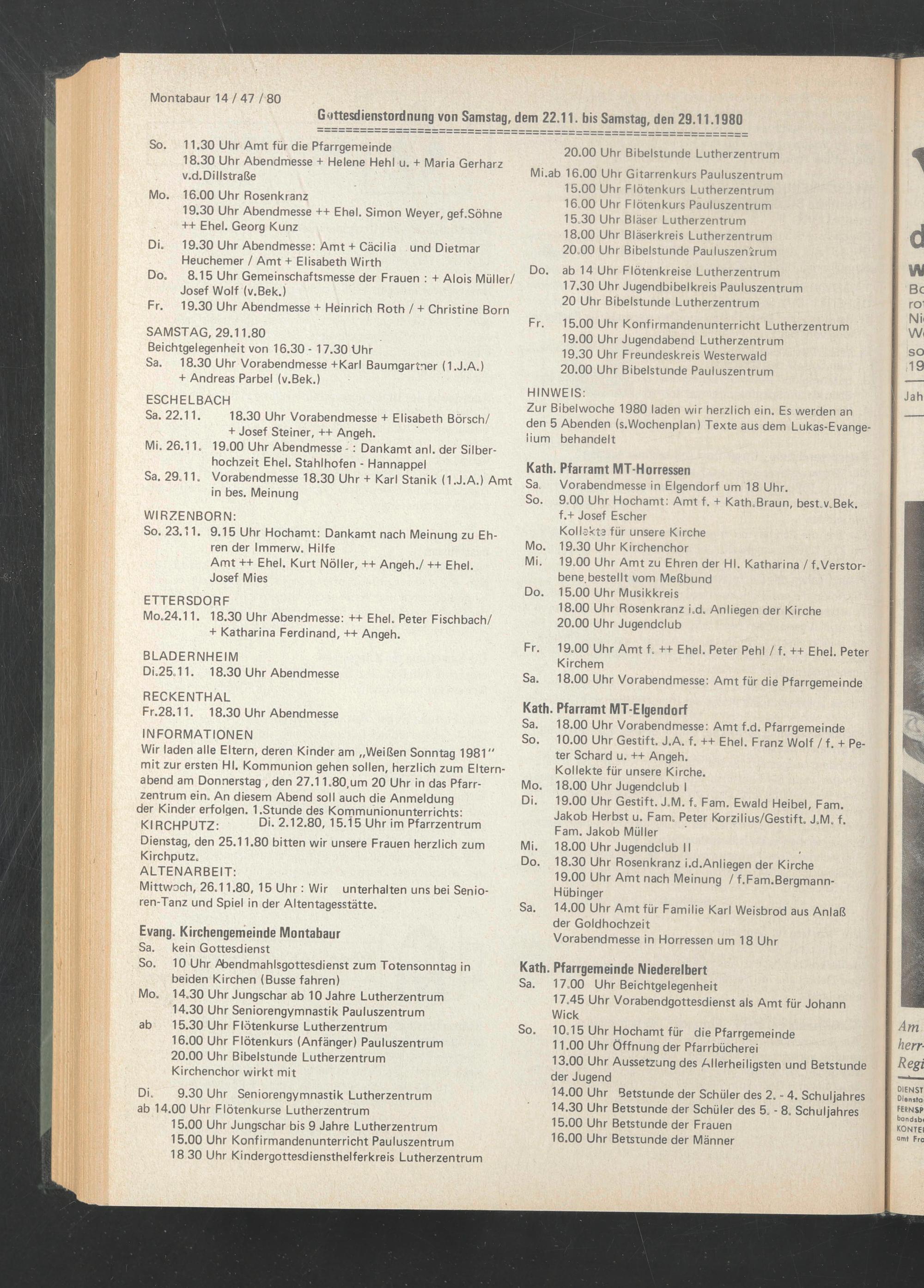 Guttesdienstordnung von Samstag, dem 22.11. bis Samstag, den 29.11.1980