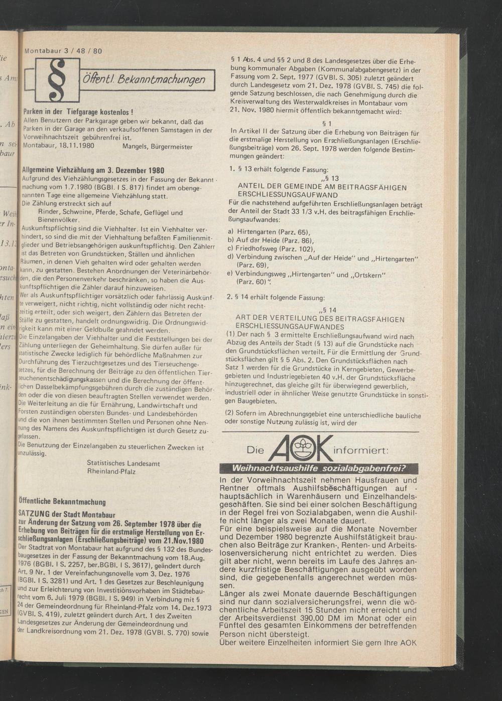 SATZUNG der Stadt Montabaur zur Änderung der Satzung vom 26. September 1978 über die Erhebung von Beiträgen für die erstmalige Herstellung von Erschließungsanlagen (Erschließungsbeiträge) vom 21.Nov.1980
