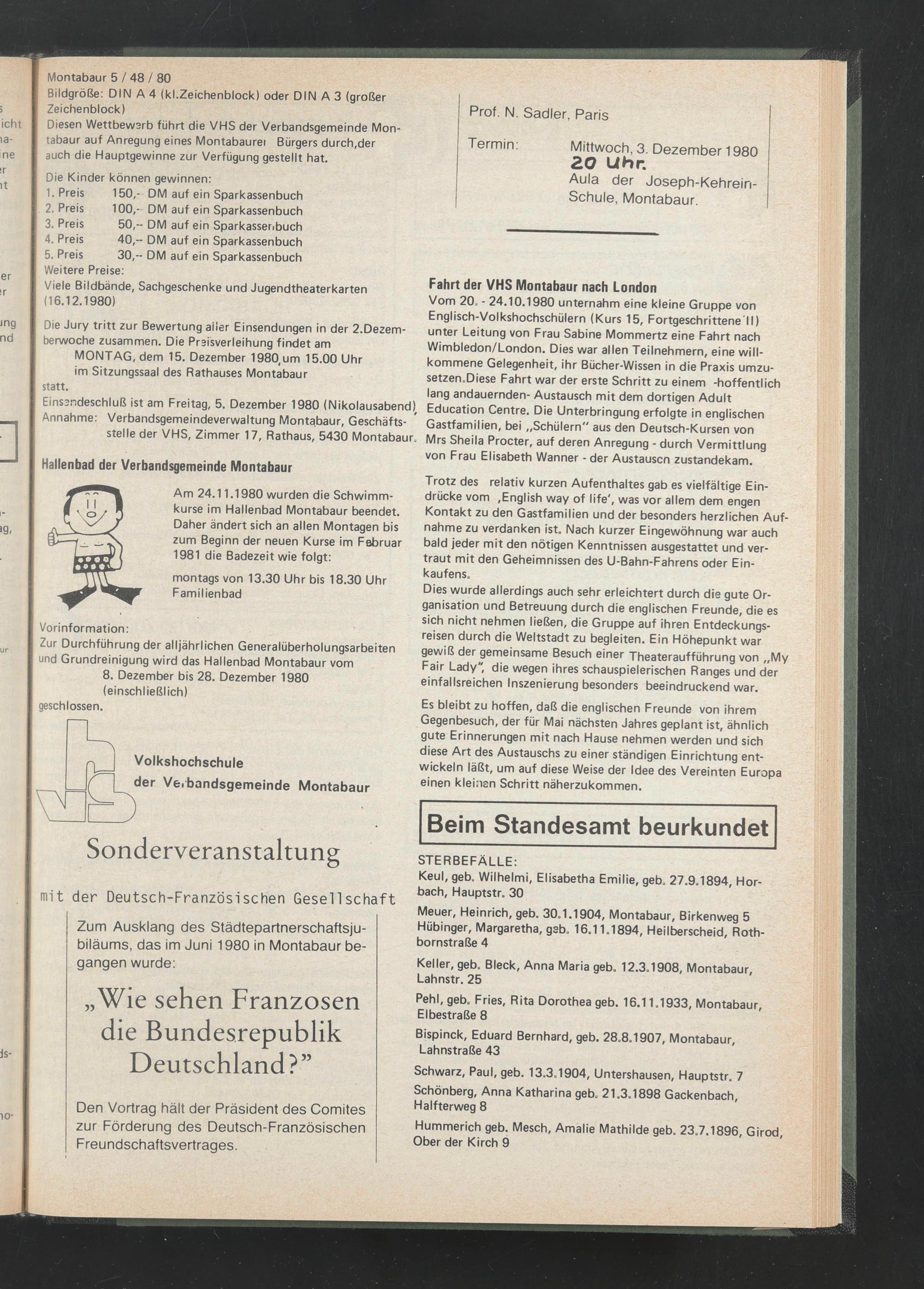 t Am 24.11.1980 wurden die Schwimmkurse im Hallenbad Montabaur beendet. Daher ändert sich an allen Montagen bis zum Beginn der neuen Kurse im Februar 1981 die Badezeit wie folgt: