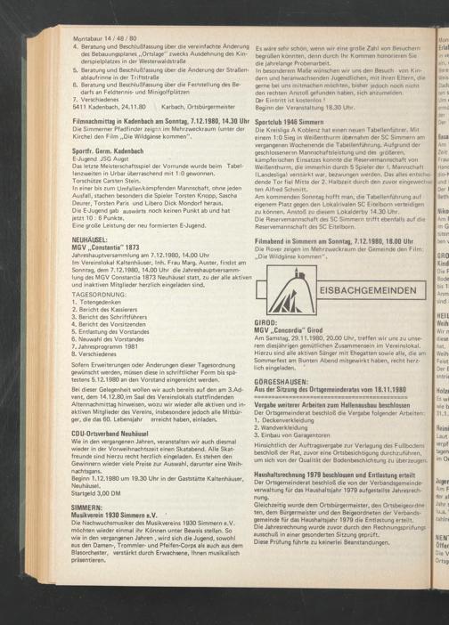 Gleichzeitig wurde dem Ortsbürgermeister, den Ortsbeigeordneten, dem Bürgermeister und den Beigeordneten der Verbandsgemeinde für das Haushaltsjahr 1979 die Entlastung erteilt.