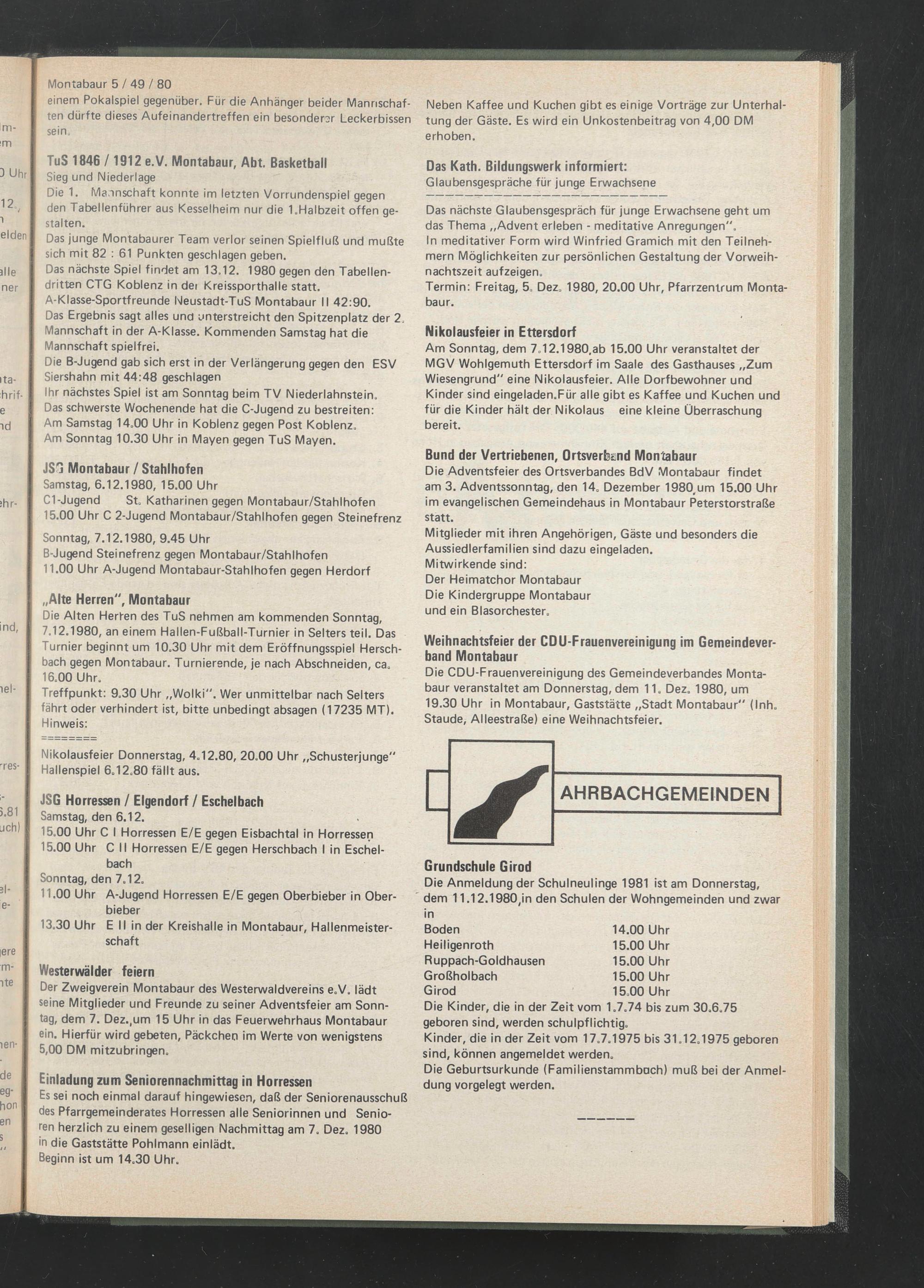 Die Adventsfeier des Ortsverbandes BdV Montabaur findet am 3. Adventssonntag, den 14. Dezember 1980,um 15.00 Uhr im evangelischen Gemeindehaus in Montabaur Peterstorstraße statt.