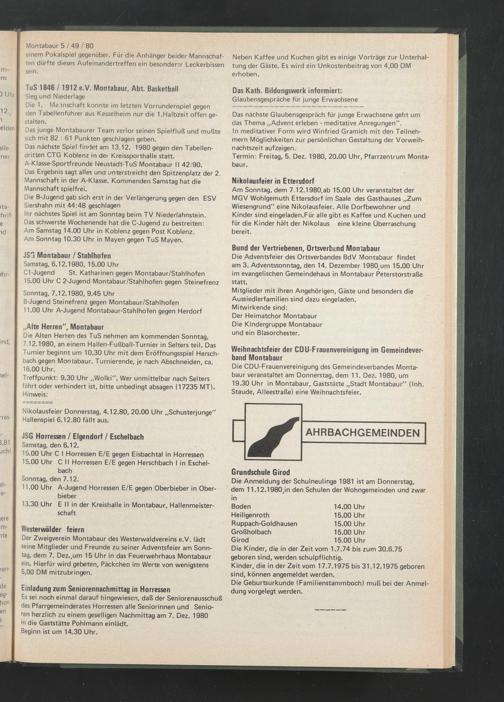 Das nächste Spiel findet am 13.12. 1980 gegen den Tabellendritten CTG Koblenz in der Kreissporthalle statt. A-Klasse-Sportfreunde Neustadt-TuS Montabaur II 42:90.