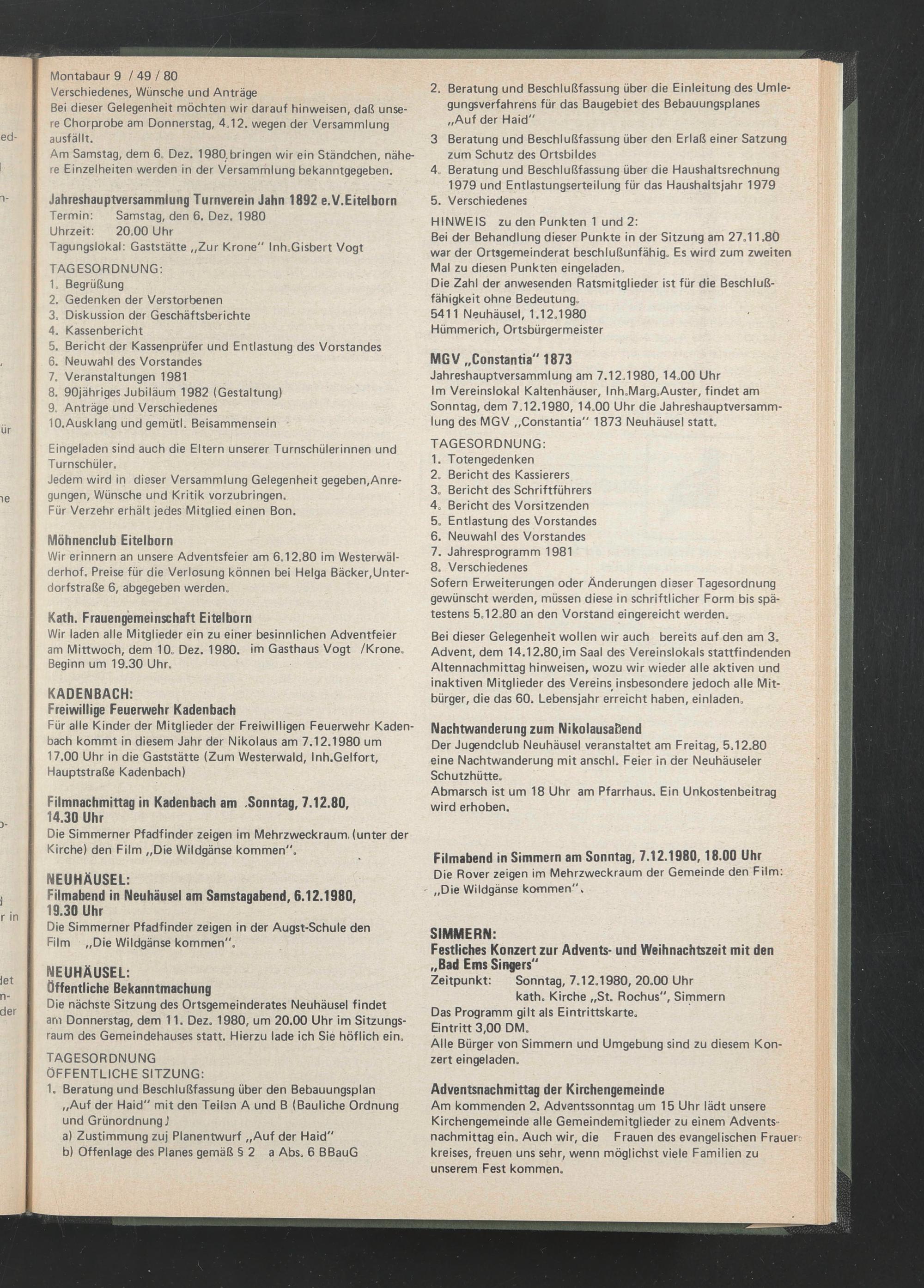 Jahreshauptversammlung am 7.12,1980, 14.00 Uhr Im Vereinslokal Kaltenhäuser, Inh.Marg.Auster, findet am Sonntag, dem 7.12.1980, 14.00 Uhr die Jahreshauptversammlung des MGV „Constantia" 1873 Neuhäusel statt.