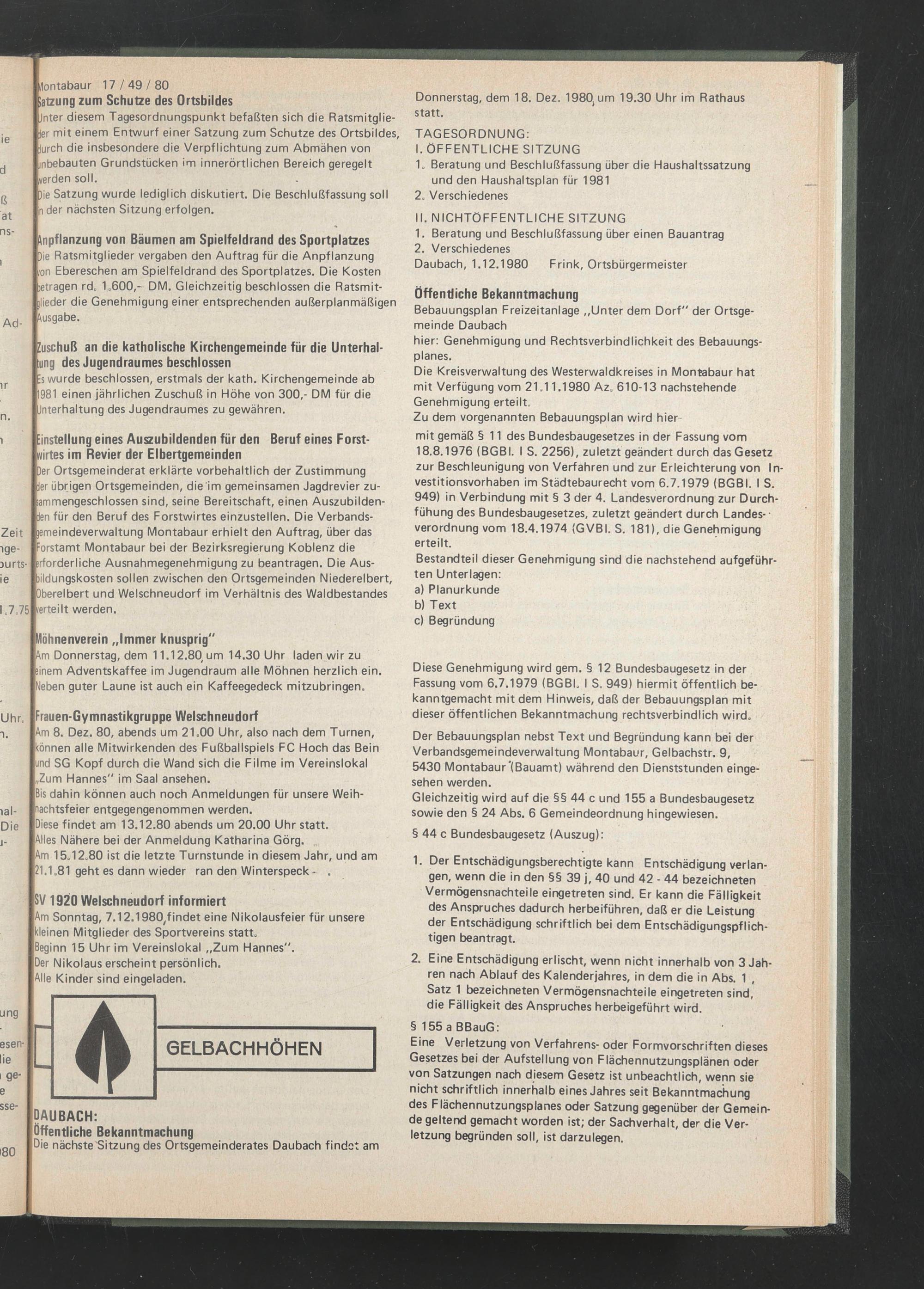 Gleichzeitig wird auf die §§ 44 c und 155 a Bundesbaugesetz sowie den § 24 Abs. 6 Gemeindeordnung hingewiesen.