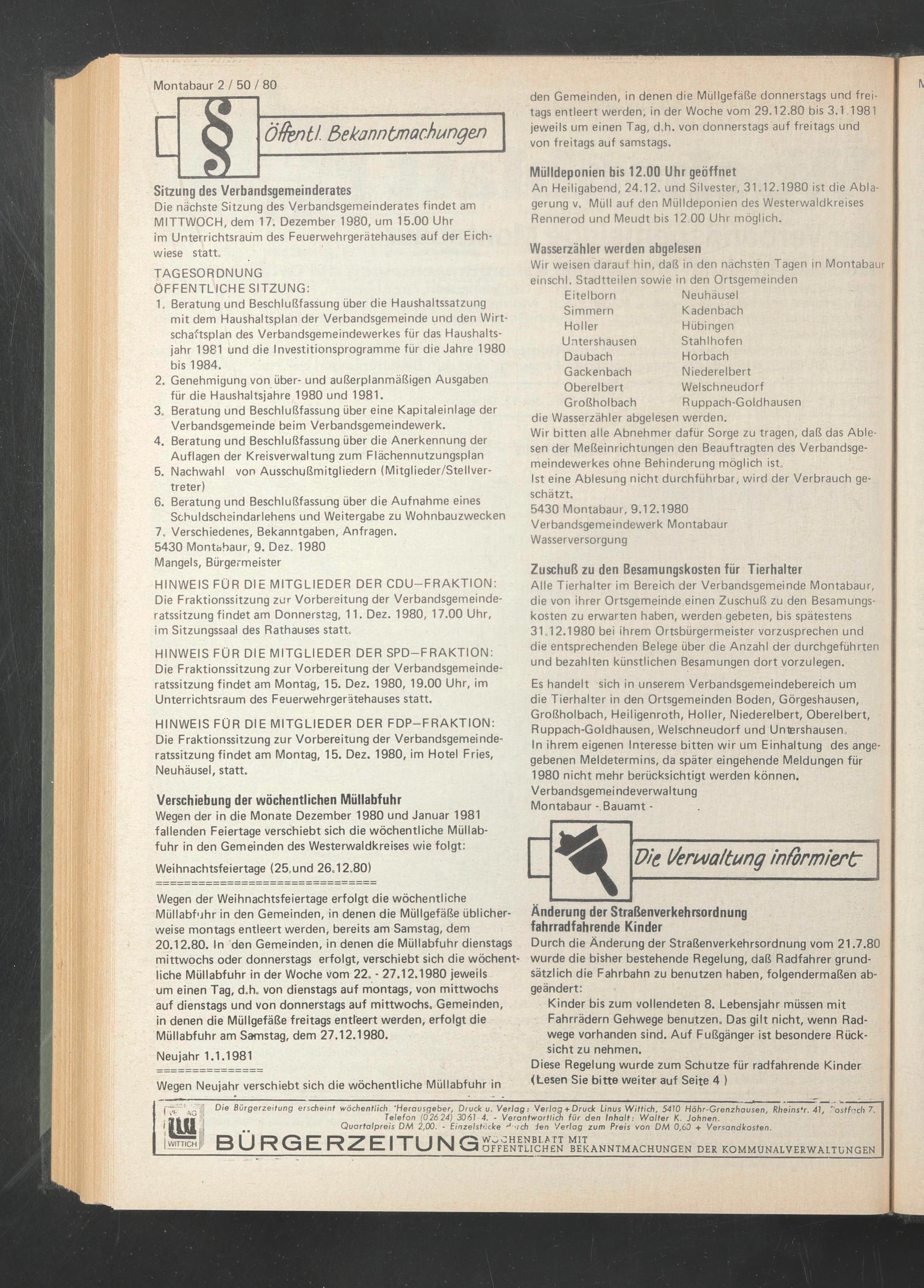 Die nächste Sitzung des Verbandsgemeinderates findet am MITTWOCH, dem 17. Dezember 1980, um 15.00 Uhr im Unterrichtsraum des Feuerwehrgerätehauses auf der Eichwiese statt.
