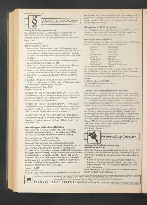 An Heiligabend, 24.12. und Silvester, 31.12.1980 ist die Ablagerung v. Müll auf den Mülldeponien des Westerwaldkreises Rennerod und Meudt bis 12 00 Uhr möglich.
