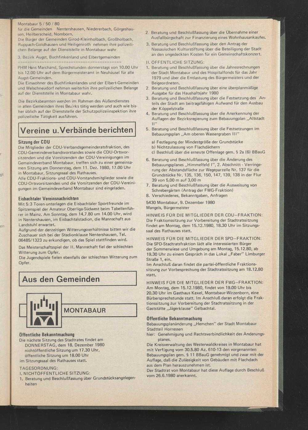 Die Mitglieder der CDU-Verbandsgemeinderatsfraktion, des CDU-Gemeindeverbandsvorstandes sowie die CDU-Ortsvor- sitzenden und die Vorsitzenden der CDU-Vereinigungen im Gemeindeverband Montabaur, treffen sich zu einer gemeinsamen Sitzung am Donnerstag, dem 11. Dez. 1980, 17.00 Uhr in Montabaur, Sitzungssaal des Rathauses.