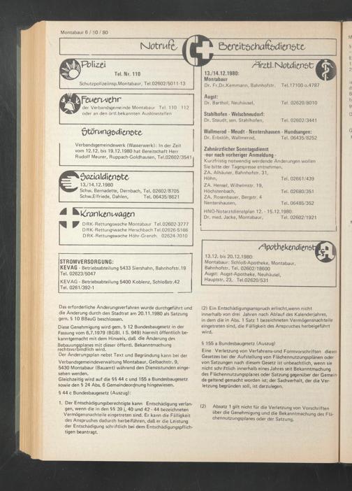 Verbandsgemeindewerk (Wasserwerk): In der Zeit vom T2.12. bis 19.12.1980 hat Bereitschaft Herr Rudolf Meurer, Ruppach-Goldhausen, Tel.02602/3541
