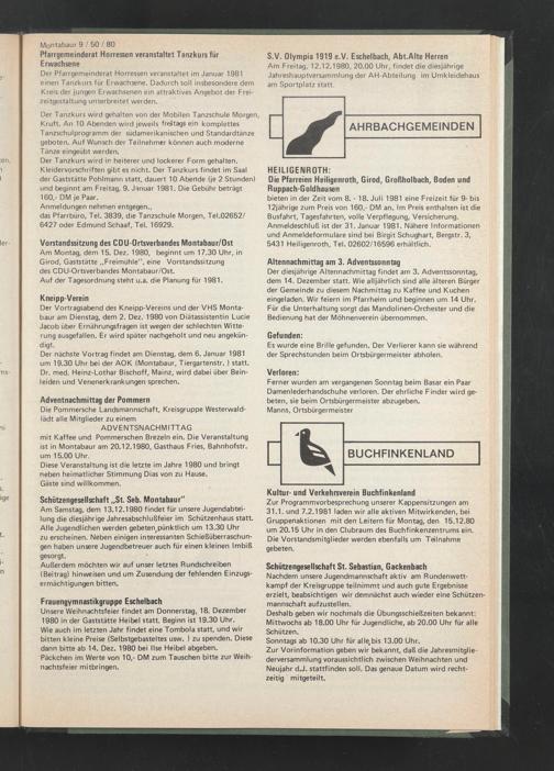 Der Vortragsabend des Kneipp-Vereins und der VHS Montabaur am Dienstag, dem 2. Dez. 1980 von Diätassistentin Lucie Jacob über Ernährungsfragen ist wegen der schlechten Witterung ausgefallen. Er wird später nachgeholt und neu angekündigt.
