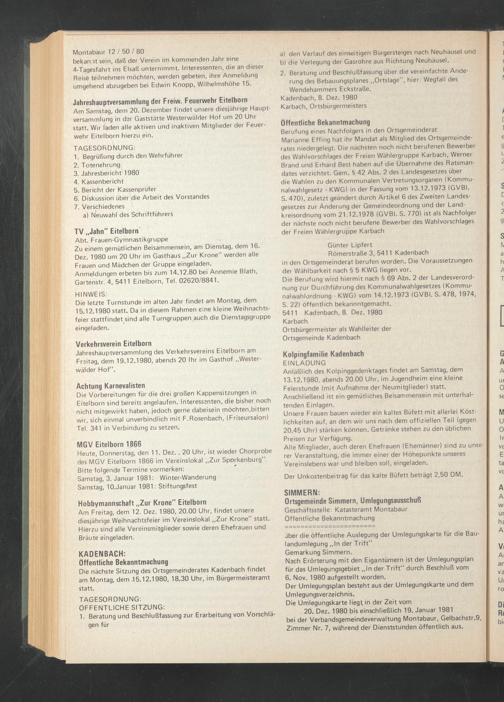 Die nächste Sitzung des Ortsgemeinderates Kadenbach findet am Montag, dem .15.12.1980, 18.30 Uhr, im Bürgermeisteramt statt.