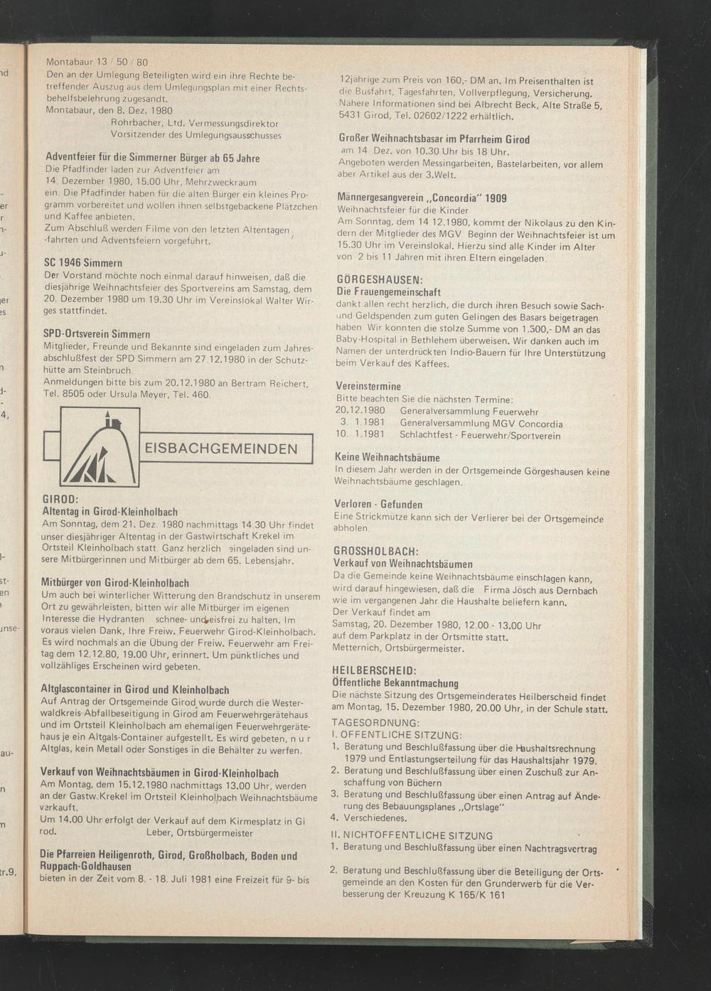 Die nächste Sitzung des Ortsgemeinderates Heilberscheid findet am Montag, 15. Dezember 1980, 20.00 Uhr, in der Schule statt,