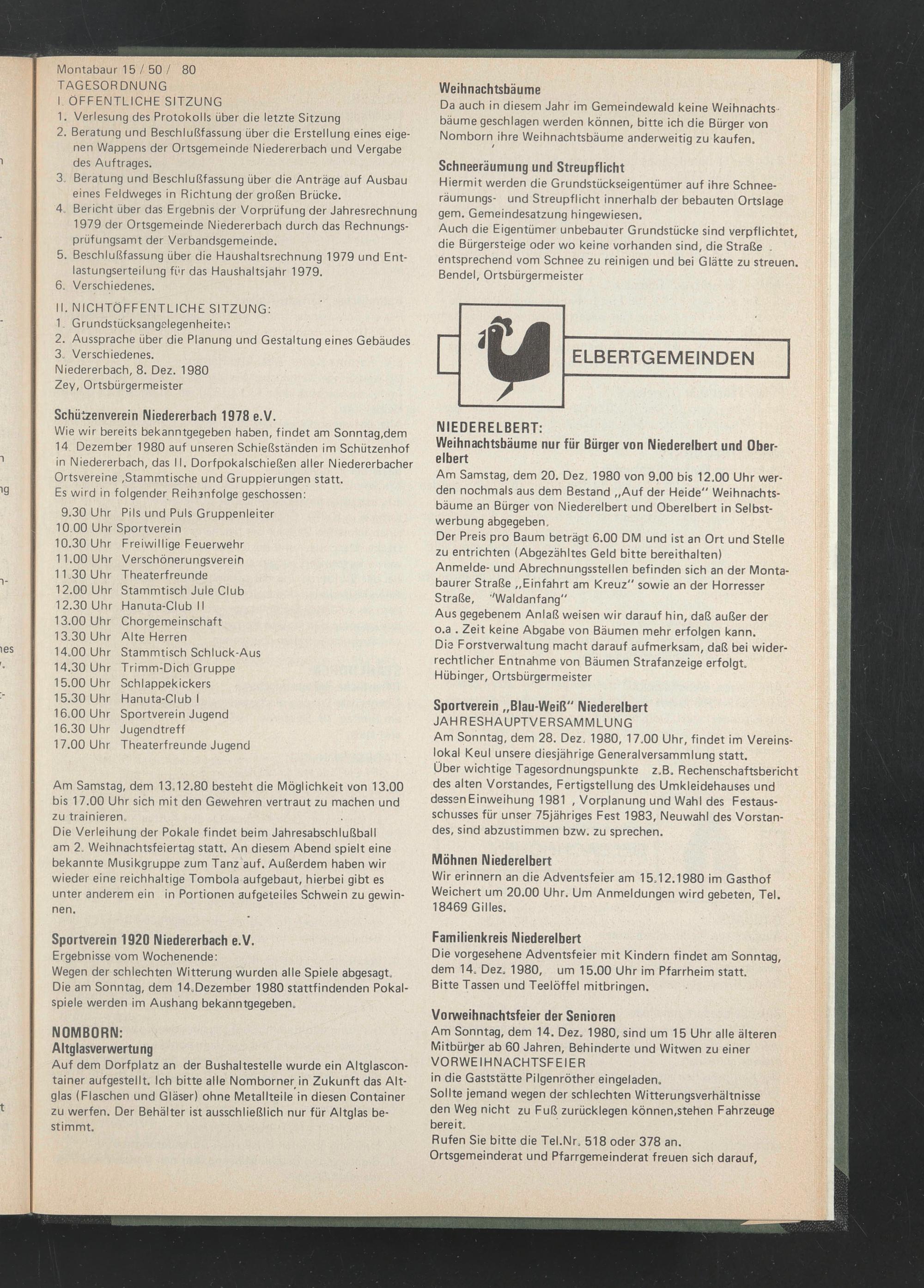 Am Samstag, dem 20. Dez, 1980 von 9.00 bis 12.00 Uhr werden nochmals aus dem Bestand „Auf der Heide" Weihnachtsbäume an Bürger von Niederelbert und Oberelbert in Selbstwerbung abgegeben.