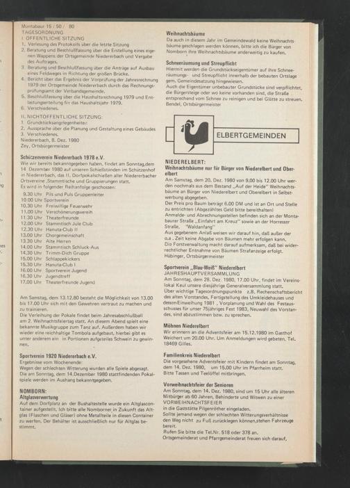 Wir erinnern an die Adventsfeier am 15,12.1980 im Gasthof Weichert um 20.00 Uhr. Um Anmeldungen wird gebeten, Tel. 18469 Gilles.