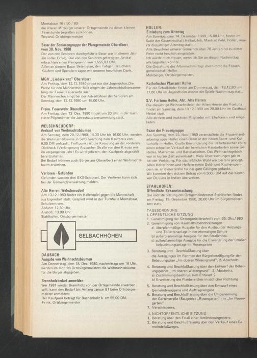 Am Donnerstag, dem 18. Dez. 1980, nachmittags um 16 Uhr, werden im Hof des Ortsbürgermeisters die Weihnachtsbäume für die Bürger abgegeben.
