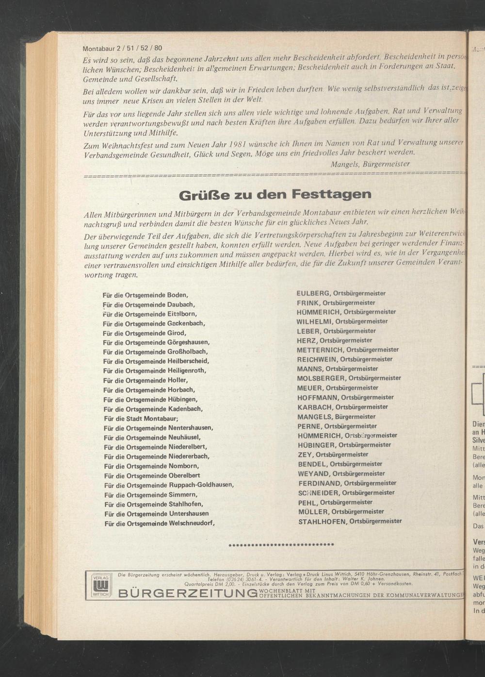 Die Bürgerzeitung erscheint wöchentlich. Herausgeber, Druck u. Verlag: Verlag + Druck Linus Wittich, 5410 Höhr-Grenzhausen, Rheinstr. 41, Postfach 7|
