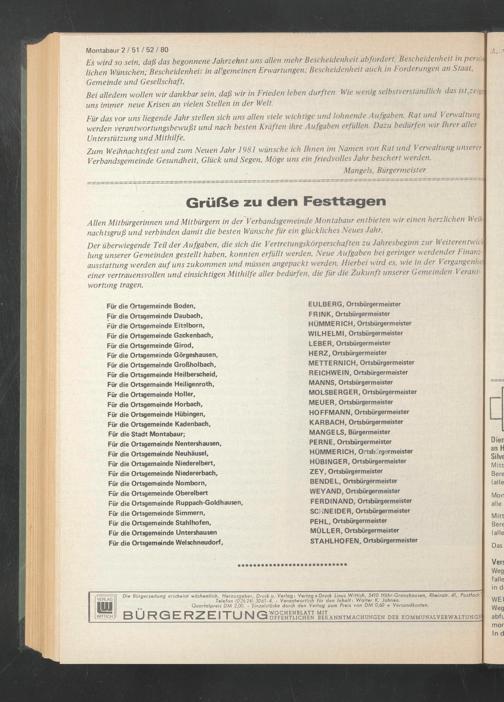 Zum Weihnachtsfest und zum Neuen Jahr 1981 wünsche ich Ihnen im Namen von Rat und Verwaltung unserer | Verbandsgemeinde Gesundheit, Glück und Segen. Möge uns ein friedvolles Jahr beschert werden.