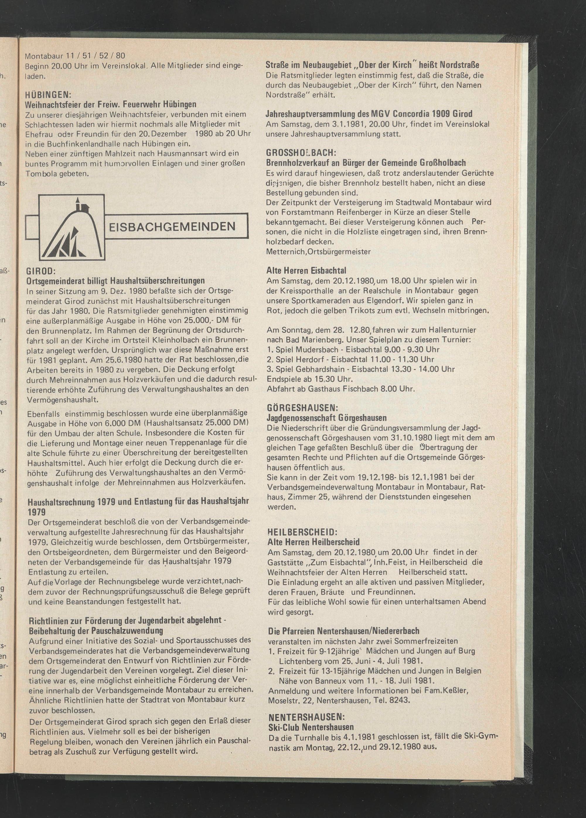 ln seiner Sitzung am 9. Dez. 1980 befaßte sich der Ortsgemeinderat Girod zunächst mit Haushaltsüberschreitungen für das Jahr 1980. Die Ratsmitglieder genehmigten einstimmig eine außerplanmäßige Ausgabe in Höhe von 25.000,- DM für den Brunnenplatz. Im Rahmen der Begrünung der Ortsdurchfahrt soll an der Kirche im Ortsteil Kleinholbach ein Brunnenplatz angelegt werfden. Ursprünglich war diese Maßnahme erst für 1981 geplant. Am 25.6.1980 hatte der Rat beschlossen,die Arbeiten bereits in 1980 zu vergeben. Die Deckung erfolgt durch Mehreinnahmen aus Holzverkäufen und die dadurch resultierende erhöhte Zuführung des Verwaltungshaushaltes an den Vermögenshaushalt.