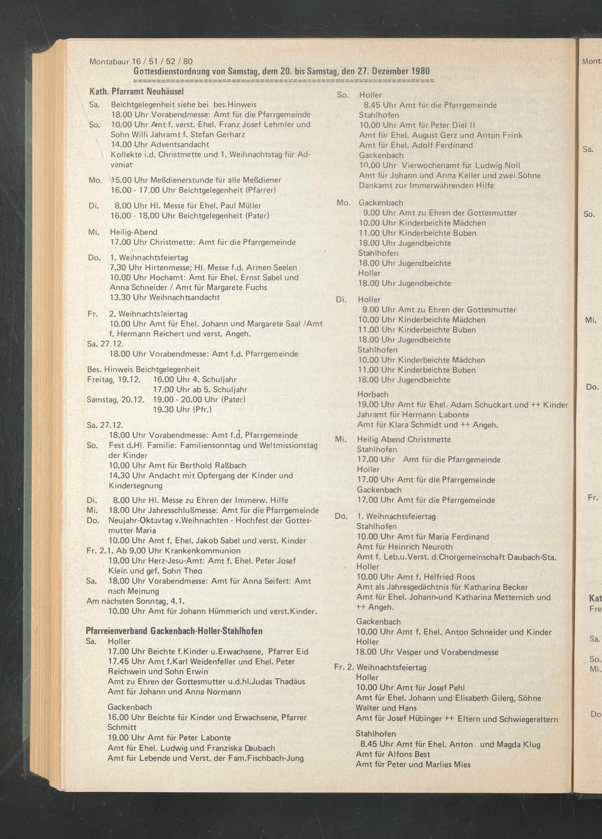 Gottesdienstordnung von Samstag, dem 20. bis Samstag, den 27. Dezember 1980