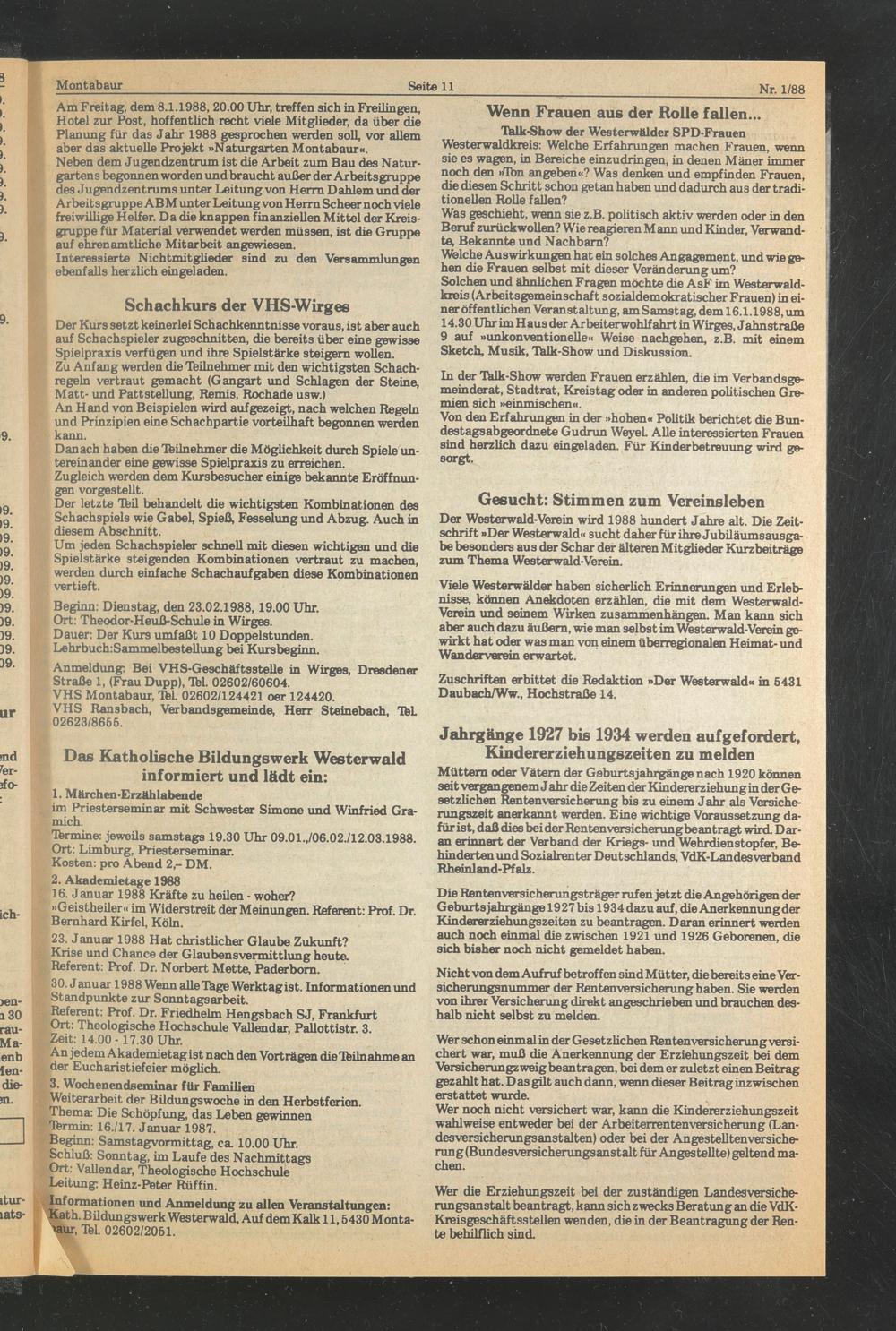 Solchen und ähnlichen Fragen möchte die AsF im Westerwaldkreis (Arbeitsgemeinschaft sozialdemokratischer Frauen) in einer öffentlichen Veranstaltung, am Samstag, dem 16.1.1988, um 14.30 Uhr im Haus der Arbeiterwohlfahrt in Wirges, J ahn straße 9 auf »unkonventionelle« Weise nachgehen, z.B. mit einem Sketch, Musik, Tälk-Show und Diskussion.