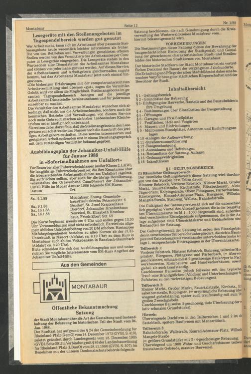 der Stadt Montabaur über die Art der Gestaltung und Instandhaltung der Bebauung im historischen Tfeil der Stadt vom 04. Jan.1988.