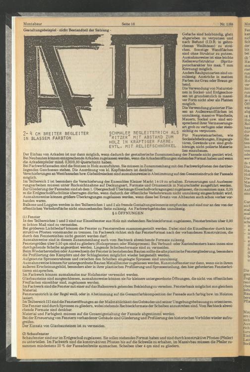 Der Einbau von Arkaden ist nur dann möglich, wenn dadurch der gestalterische Zusammenhang der Fassade nicht gestört wird. Bei Neubauten können entsprechende Arkaden zugelassen werden, wenn die Arkadenöffnungen stehendes Format haben und wenn die Arkadenpfeiler mind. 0,30/0,30 Querschnitt haben.