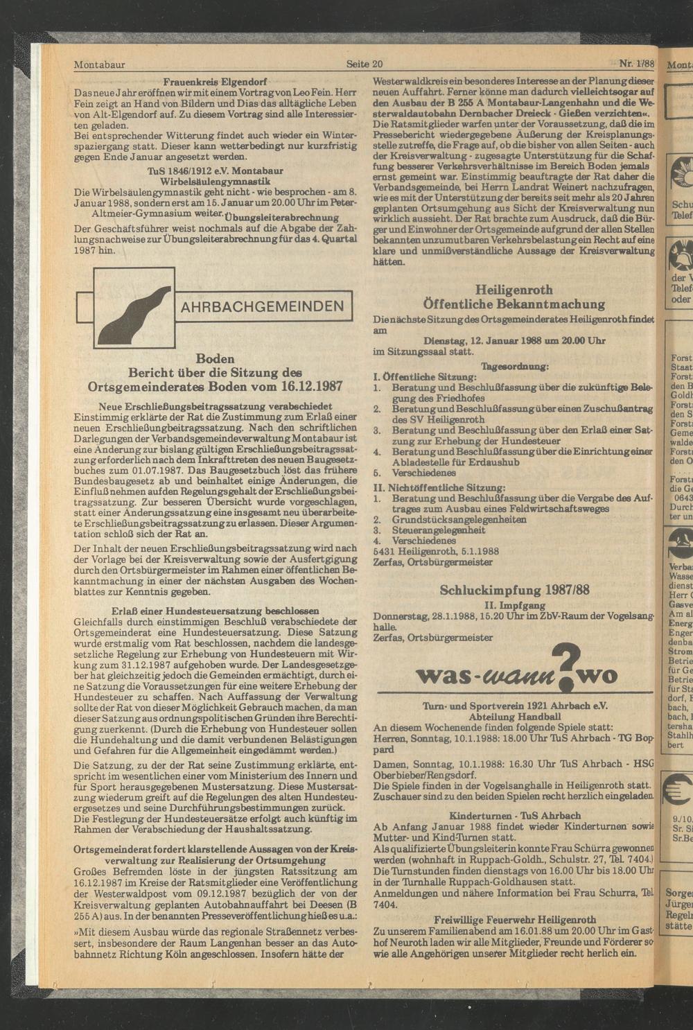 Bericht über die Sitzung des Ortsgemeinderates Boden vom 16.12.1987