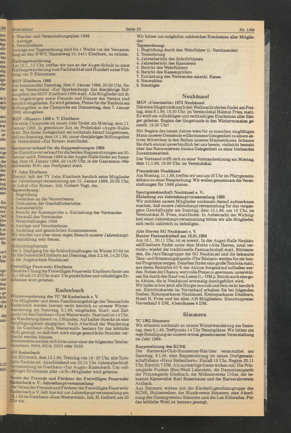 Die erste Übung der Freiwilligen Feuerwehr Eitelbom findet am 15.1.88 um 19.30 Uhr statt. Umpünktliches und vollzähliges Erscheinen wird gebeten.