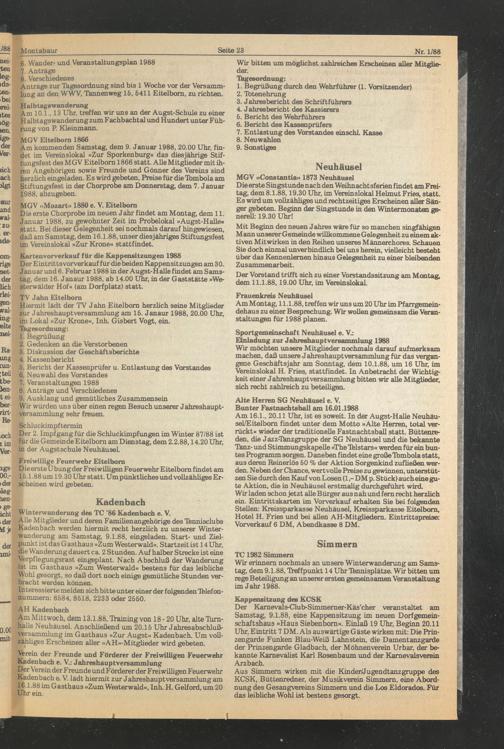Am Mittwoch, dem 13.1.88, Training von 18-20 Uhr, alte Tirn- halle Neuhäusel. Anschließend um 20.16 Uhr Jahresabschlußversammlung im Gasthaus »Zur Augst« Kadenbach. Um vollzähliges Erscheinen aller »AH«-Mitglieder wird gebeten.