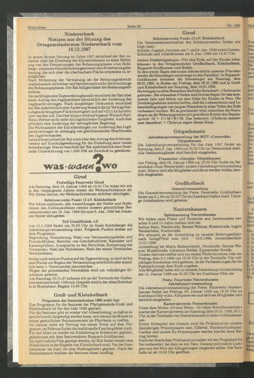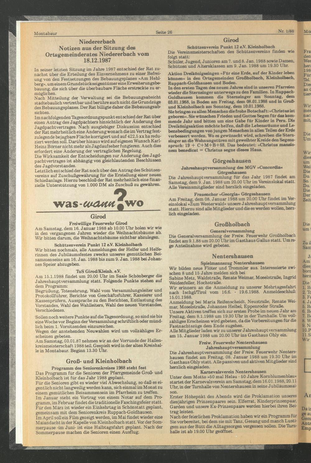 Die Generalversammlung der Freiw. Feuerwehr Großholbach findet am 9.1.88 um 20.00 Uhr im Gasthaus Gallus statt. Um rege Anteilnahme wird gebeten.